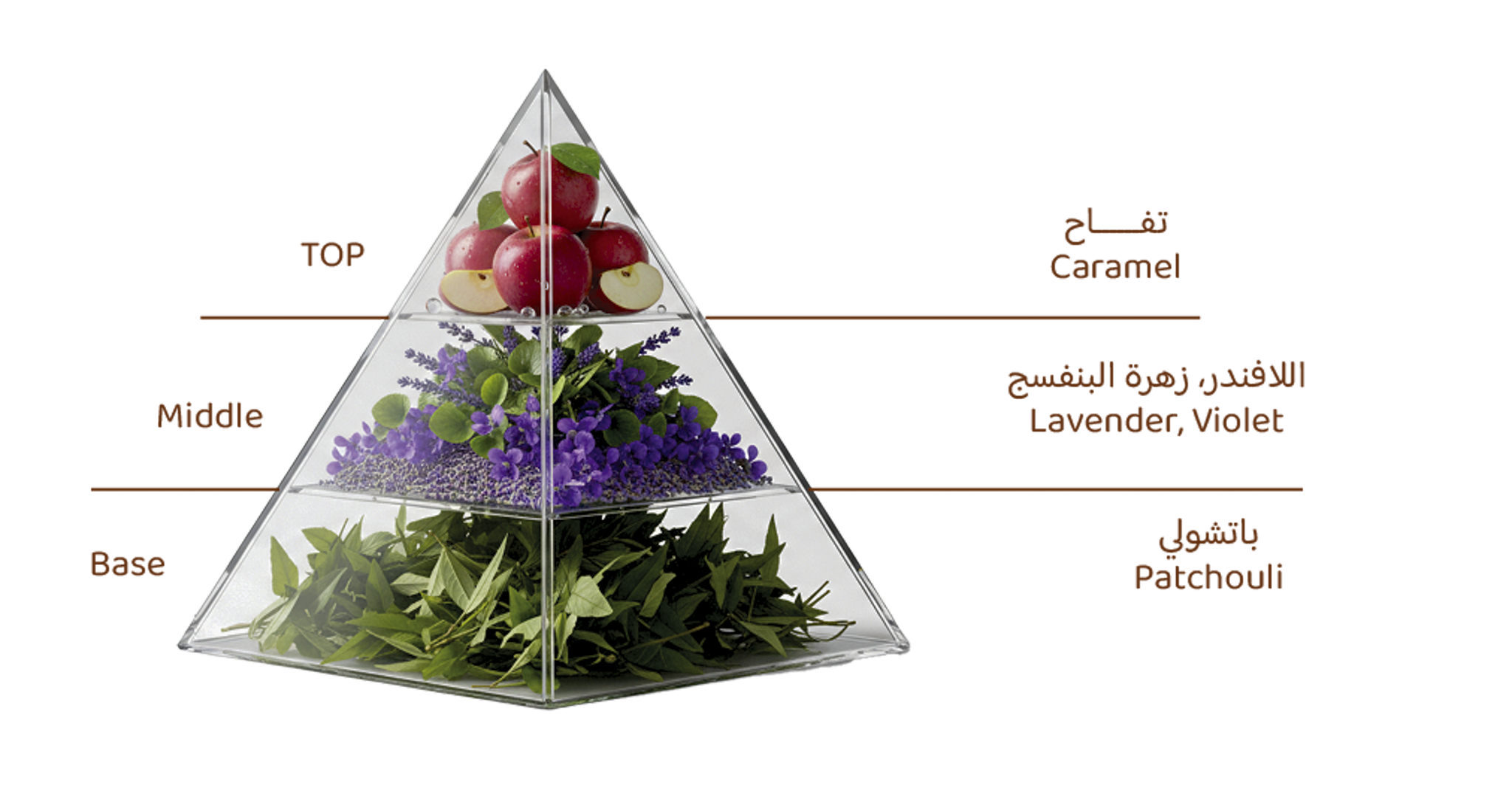 A refreshing fruity note of apple with an elegant bouquet of captivating flowers, blended with a warm woody scent of patchouli and amber.